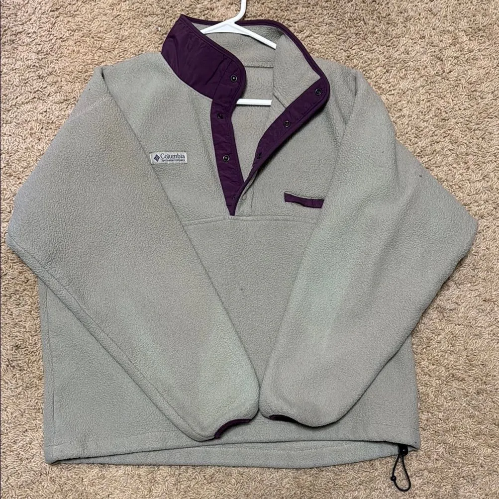 Soft Columbia fleece jacket in heather gray with deep purple trim. Snap-button collar and convenient... Show more