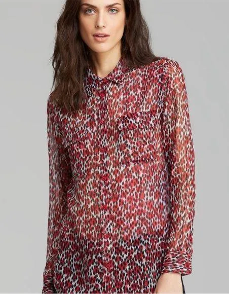Equipment Femme Slim Signature Leopard Print Silk Top Size Small Colors: Red, Black, and White Sheer Fabric Front Button Closure Designer Printed Buttons 2 Flap Chest Pockets Shirttail Hem Dry Clean 100% Silk Amazing preowned condition with no known flaws, see pics for details