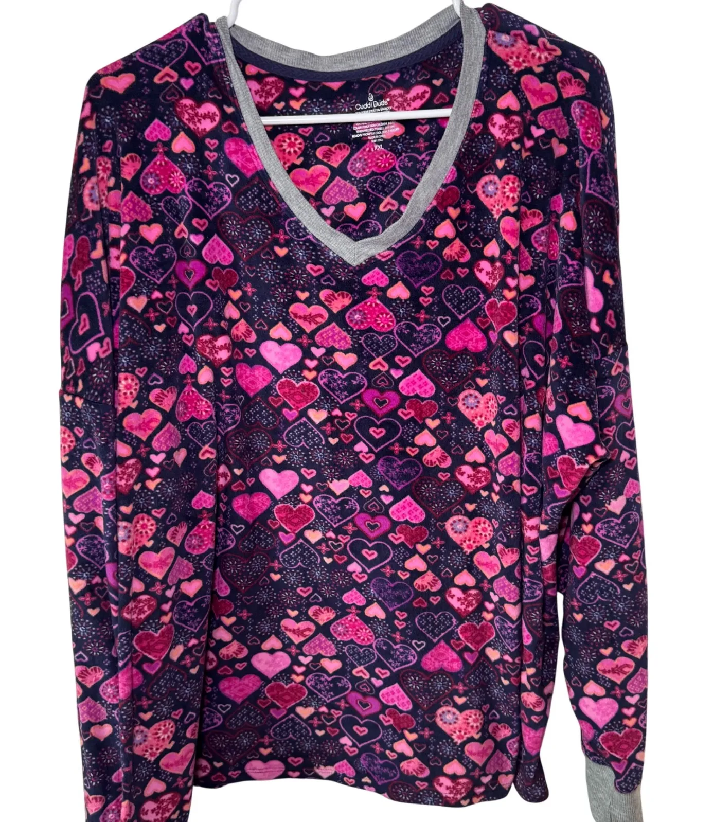Type: Pajama Top Department: Women Theme: Heart Pattern: Graphic Print Material: Polyester Fabric Type: Fleece Sleeve Length: Long Sleeve Season: Fall, Winter, Spring Neckline: V-Neck Garment Care: Machine Washable Country of Origin: India Unit Type: Unit Keywords: plush fleece, pajama top, long sleeve, heart print, loungewear, sleepwear, cozy, soft, v-neck, oversized, casual, pink, purple, navy