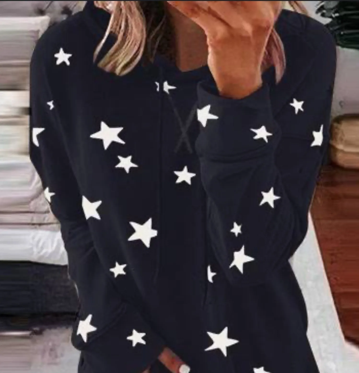 Cuddl Duds Women’s Size M Star Print Crewneck Sweater Navy Blue Americana Cozy Preowned condition Gently used- normal wear no major flaws No rips no stains ect Cozy fit Great for baselayer or layering piece Kangaroo pockets Note: Stock photo is slightly different version/pattern of this top