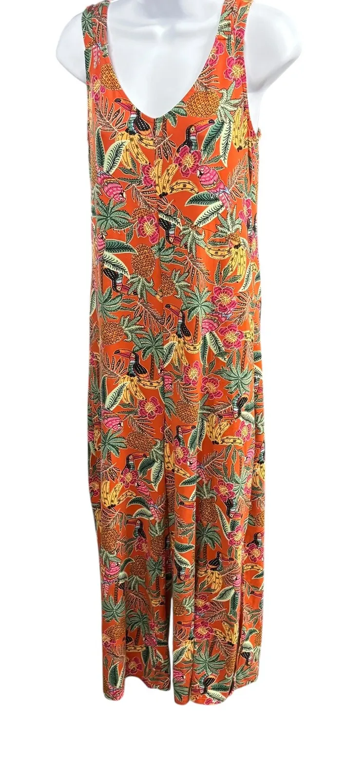 Eye-catching jumpsuit featuring a vibrant tropical design. Showcasing an orange backdrop adorned with playful toucans, pineapples, and tropical foliage in shades of green, yellow, and pink, this sleeveless jumpsuit offers a relaxed and breezy silhouette. The design includes a V-neckline, a wide-leg cut with side slits at the hem, and practical side pockets, combining comfort with a touch of exotic flair. Color: Orange Department: Women Type: One-Piece Style: Jumpsuit Character Family: Tropical, Birds, Pineapple Fabric Type: Rayon Material: Spandex, Rayon Pattern: Floral Sleeve Length: Sleeveless Character: Toucan Occasion: Casual, Travel, Party/Cocktail Set Includes: Jumpsuit Number of Pieces: 1 Piece Keywords: Cuddl Duds, Tropical Jumpsuit, Toucan Print, Sleeveless Jumpsuit, Wide Leg Jumpsuit, Orange Jumpsuit, XS Jumpsuit, Summer Jumpsuit, Vacation Outfit, Resort Wear, Bohemian Style, Casual Jumpsuit