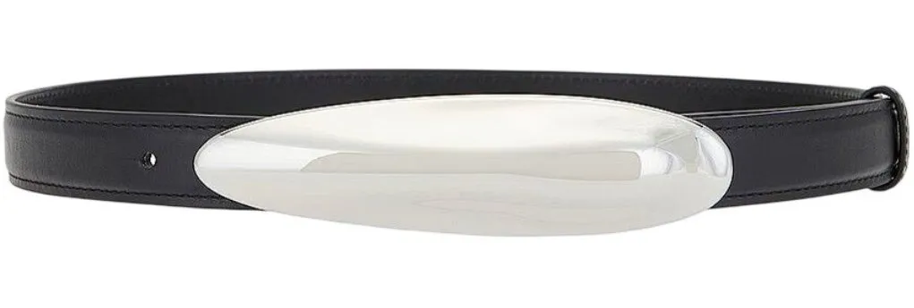 Thin smooth leather waist belt designed with shiny silver curved buckle. Cow leather with silver-tone zinc alloy buckle Push buckle closure M/L -32.75-37.75in / 83-96cm Buckle measures approx 5.25" W x 1.75" H Our Style No. GAIA-WA13 Manufacturer Style No. BE3268NP1674 Color: Black MSRP: $258 Size: Womens M/L Condition: New With Tags With FWRD partial tag, stud has been replaced tags: fashion, style, men's, women's, accessories, streetwear, neutral, nude, business casual, logos, designer, preppy, thick, logo, emblem, signature, designer, luxury, high end, runway