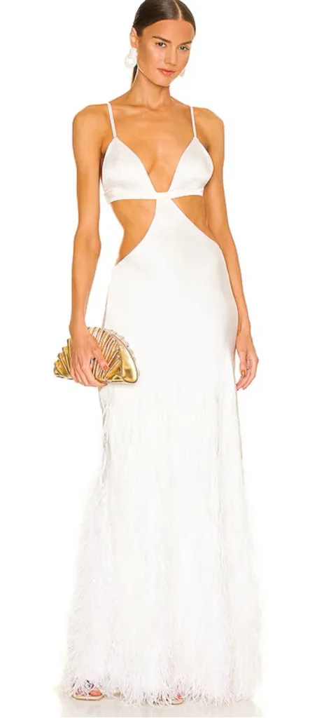 NEW NWT The Raisa Gown is artfully adorned with ostrich feather embroidery from the skirt cascading to the hem. The silky satin fabric is lined in polyester and drapes down from the bust in thoughtful cutouts that flatter the small of the waist. Thin shoulder straps reveal an open back. The rear strap is adjustable and the skirt sits on the hips. • HAND WASH • FULLY LINED • BACK HOOK AND BAR CLOSURE WITH ELASTIC STRAP HIDDEN BACK ZIPPER CLOSURE • WAIST CUT-OUT Body: 100% Silk Satin Lining: 100% Polyester Embroidery: 100% Ostrich Feather Y2K, Summer, spring, striped, retro, 60s, 70s, 80s, 90s, boho, bohemian, lightweight, airy, breezy, date, brunch, hollywood, celebrity, melrose, sustainable, eco-conscious, eco-friendly, fitted, a-line, fit & flare spring, retro, midi, thigh split, velvet, stretch, flattering, feminine, flirty, fitted, curvy, dual chromatic, forest, Lace, Sparkle, Neck, Frill, Romantic, Bardot, Travel, Blogger, Party, airy, bow, highwater, crop, high end, silk, runway, New Years, holidays party dress, night out, date night, ladies night, hippie,concert, hipster, music festival, fringes, embroidery, stripes, plunging neckline ,Doen, Coachella, tomatoe girl, pinup, ROMANTICISM REDEFINED. Bloggers favorite, Leather, suede, free people, urban outfitters, cowboy, western, tassles, Black tie