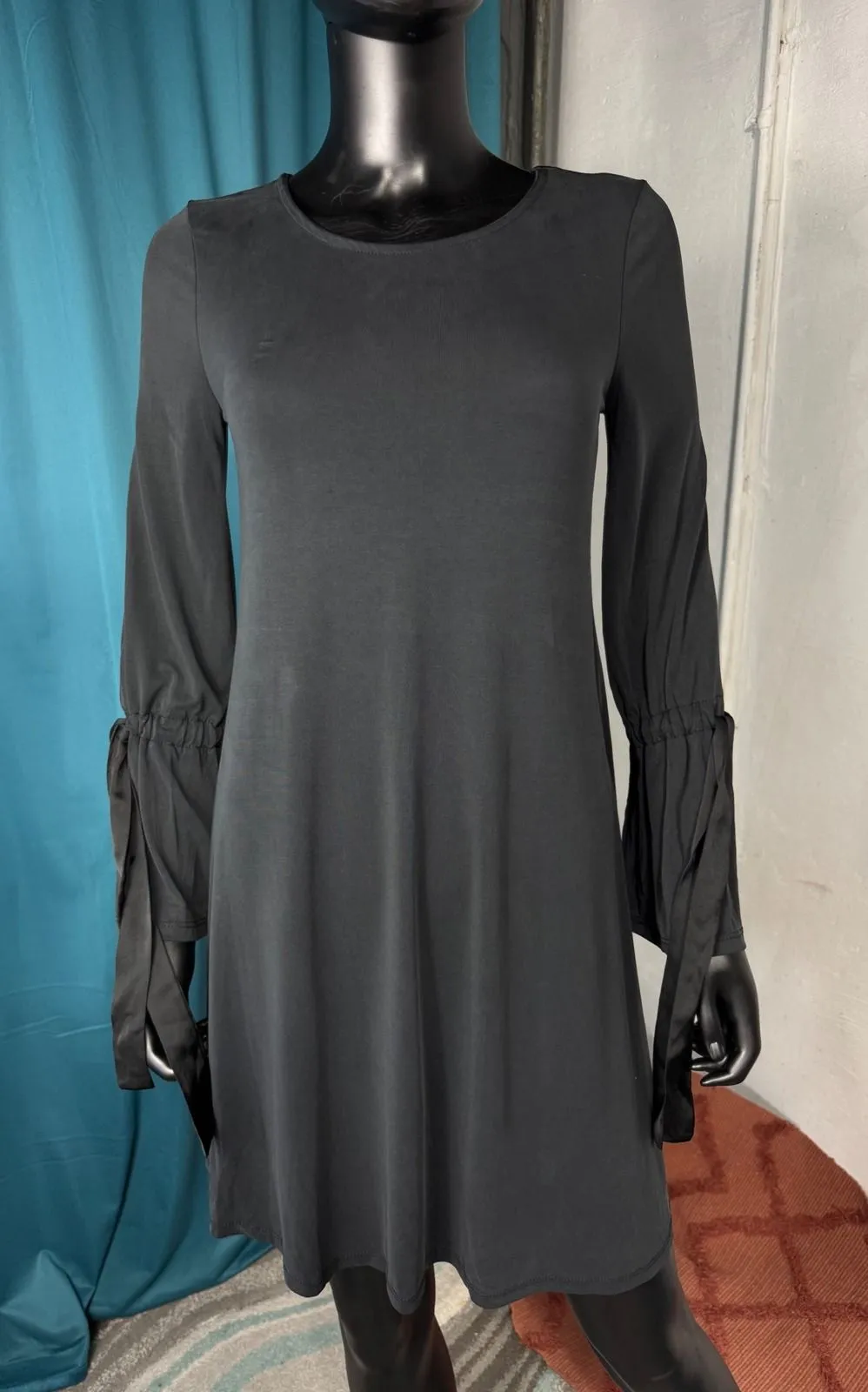 Chic Cupio dress crafted with a flattering A-line silhouette and alluring tie detail on the bell sleeves. This versatile black dress offers a sophisticated yet playful vibe, perfect for transitioning from a day at the office to an evening out. The elegant design ensures you'll feel confident and stylish wherever you go. Ideal for brunch with friends, a casual date night, or a stylish work ensemble. Measurements: • Bust: 15 in • Length: 35 in Style: Shift, A-Line Dress Length: Knee Length Department: Women Sleeve Length: Long Sleeve Pattern: Solid Occasion: Casual, Party/Cocktail Material: Modal, Polyester Blend Fabric Type: Knit Theme: Bohemian Neckline: Round Neck Season: Spring, Fall Garment Care: Machine Washable Country of Origin: China Unit Type: Unit Keywords: Cupio dress, black dress, long sleeve dress, tie sleeve, bell sleeve, a-line dress, women's dress, casual dress, work dress, evening dress, sophisticated, elegant, petite