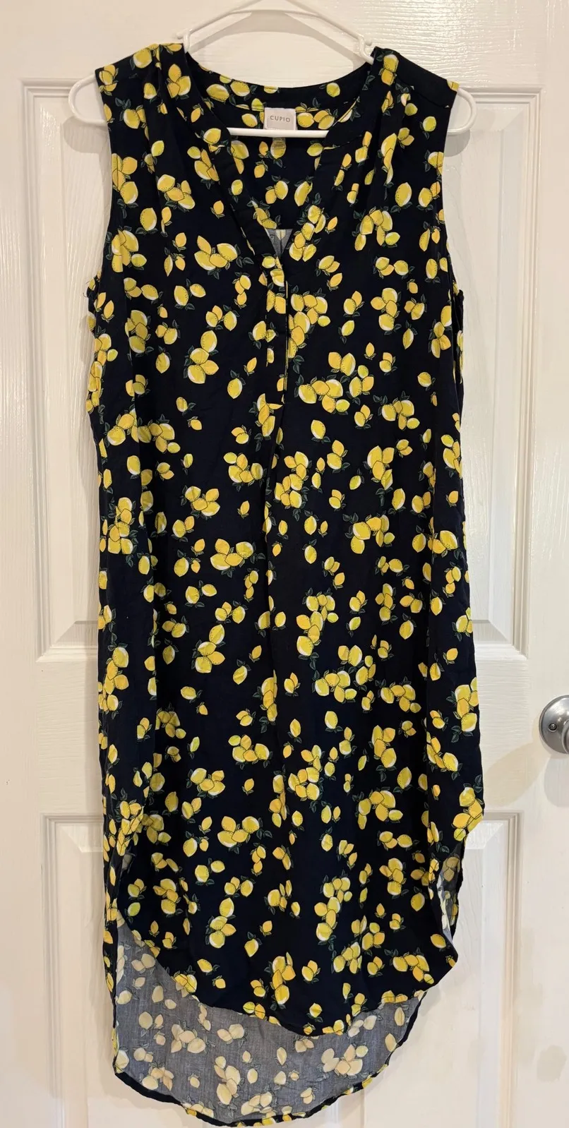Charming lemon-print midi dress, perfect for adding a touch of sunshine to your wardrobe. This sleeveless dress features a flattering V-neck and a unique high-low hemline, creating a breezy, effortless silhouette. The vibrant yellow lemon pattern pops against the dark navy backdrop, making it an eye-catching piece. This dress is ideal for a casual brunch with friends, a summer picnic, or a day of strolling through a farmers market. Style: Shirt Dress, Sundress, T-Shirt Dress Dress Length: Midi Color: Black Department: Women Sleeve Length: Sleeveless Pattern: Floral Occasion: Casual, Travel, Party/Cocktail Material: Viscose Neckline: V-Neck Character: Lemon, Summer, Casual, Vacation, Chic Fabric Type: Woven Season: Spring, Summer