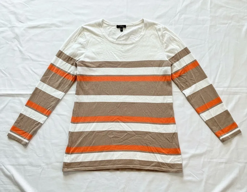 Lightweight Cupio striped sweater top featuring tan, white, and peach tones with a comfortable stretch fabric. Versatile piece perfect for layering and everyday wear across multiple seasons. Brand & Era: Cupio, modern Fit: Women’s size medium, lightweight regular fit Features & Closure: Scoop neckline, long sleeves, striped design, lightweight knit Material & Color: Rayon and nylon blend, tan, white, and peach-orange stripes Origin: Made in China Condition: Good used condition — small snag on the back of one arm; minimal wear around arms and sides as shown. Measurements: Length: 27 inches Bust: 32 inches (16 inches flat) Sleeve Length: 23 inches Style Tags: classic, preppy, minimalist, casual, capsule wardrobe, fall, spring, winter layering, soft girl aesthetic, everyday wear, polished, neutral tones, cozy chic, work, office, business casual
