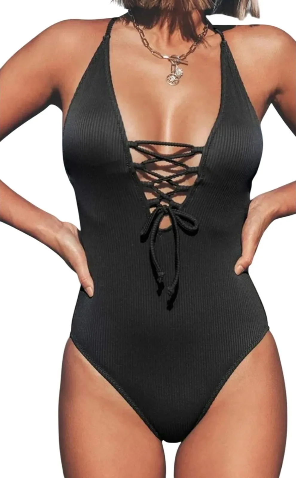 Black Ribbed Plunge Lace Up Criss Cross Back One Piece Swimsuit Type: One Piece Color: Black Depart... Show more