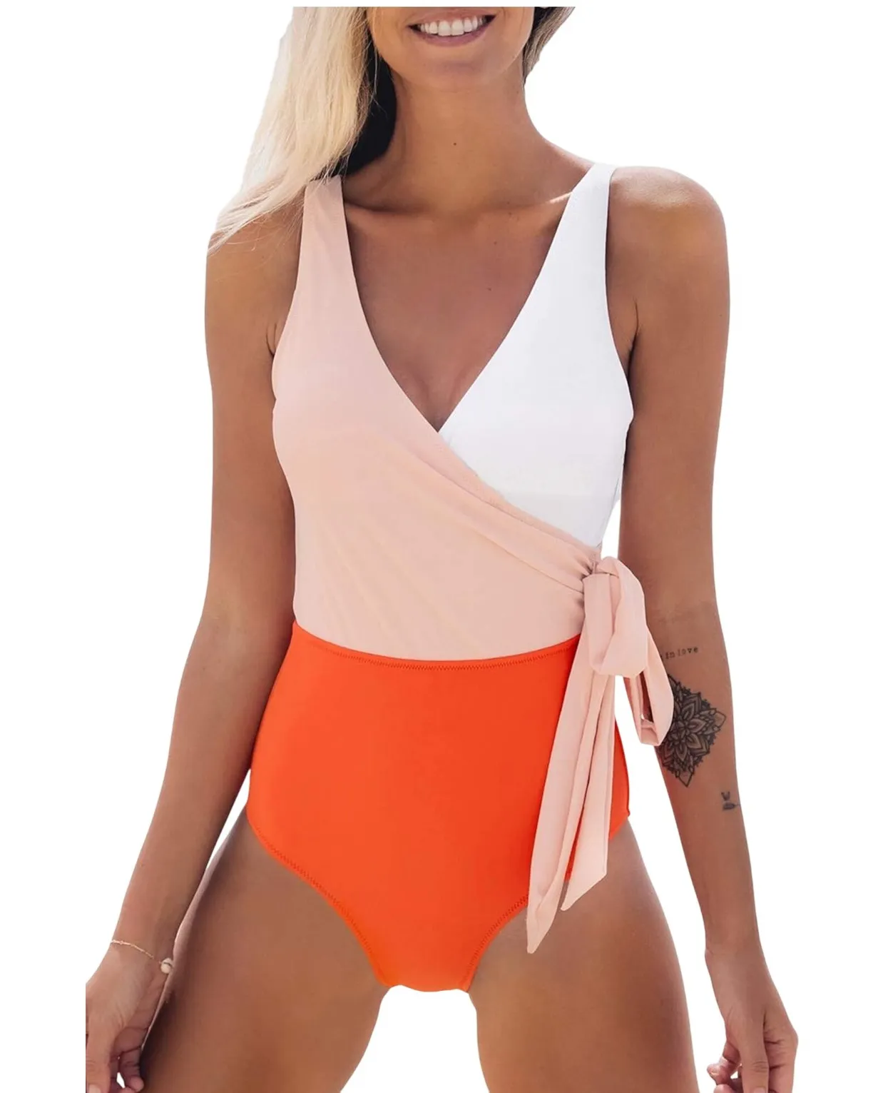 Keywords: one piece swimsuit, colorblock swimsuit, bathing suit, wrap swimsuit, tie swimsuit, orange swimsuit, white swimsuit, pink swimsuit, womens swimwear, beachwear, pool attire, modern swimsuit, designer swimsuit, stylish swimsuit
