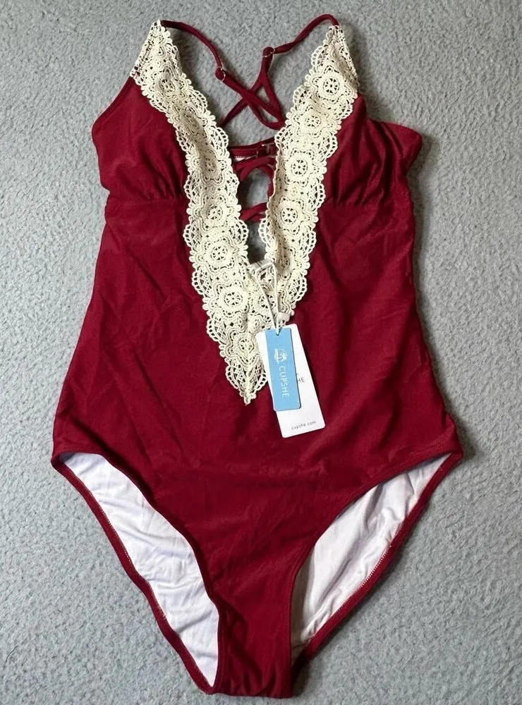Cupshe Swimsuit Womens M Burgundy Lace Plunge One Piece Swimsuit NEW Features: Sleeveless V Neck Ba... Show more