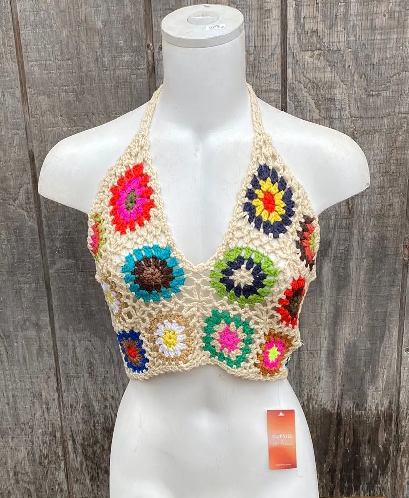 Embrace your free spirit with the Plunging Floral Crochet Crop Top. Its halterneck design and playfu... Show more