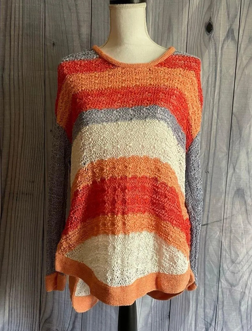 This sweater is in good condition with normal signs of wear. It does have one spot that looks to be pulled a bit but nothing major and I have shown that in the photos. It is long sleeve with side slits and a back slit. It is 55% ramie and 45% cotton. It also hand wash only item. Great looking sweater for the upcoming winter months. Pit to pit is 22 inches Length in front is 25 1/2 inches Length in back is 28 inches