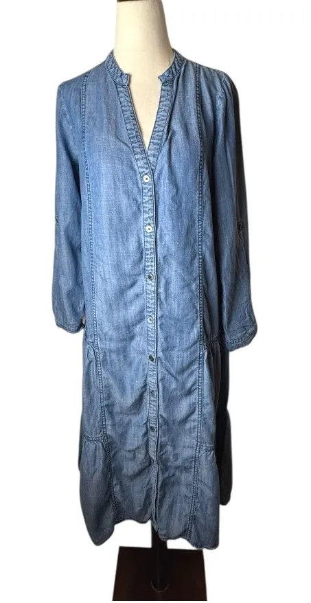 A chambray button-down midi dress offering a flattering v-neckline and a stylish tiered hem. This versatile dress features long roll-tab sleeves with button cuffs, and a full button-front closure for adjustable styling. Its relaxed yet refined silhouette makes it perfect for a casual day out, a weekend brunch, or a relaxed office environment. Great Pre-Owned Condition (see pics for details) Flaw: The fabric sash is missing. I wore a regular belt with it. Measurements: armpit to armpit 18.5 in, length 41 in, sleeve 21 in designer, luxury, anthro, anthropologie, tencel, lyocell, denim, chambray, shirt dress, casual, classic, stylish, trendy, midi, tunic, button front, business, workwear, sophisticated, boho, bohemian, festival, western, southwestern, cowboy, cowgirl, lightweight, comfy, comfortable, soft, business casual, long sleeve, all seasons, summer, winter, spring, fall