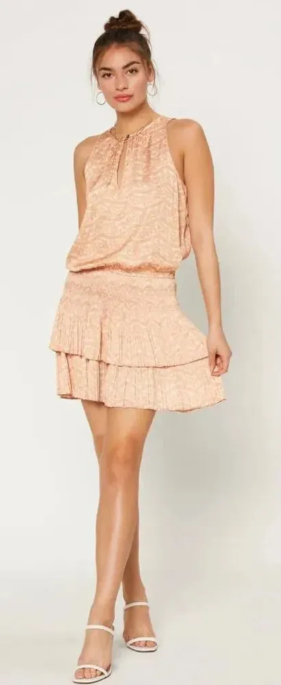Current Air The Wyland Dress in Orange Sleeveless mini dress featuring allover floral print, keyhole neckline with button, smocked waistband, and ruffle tiered skirt. Pullover. 100% polyester Size Small Armpit to armpit is approx 22" Waist is approx 12" Hip is approx 24" Length is approx 37"