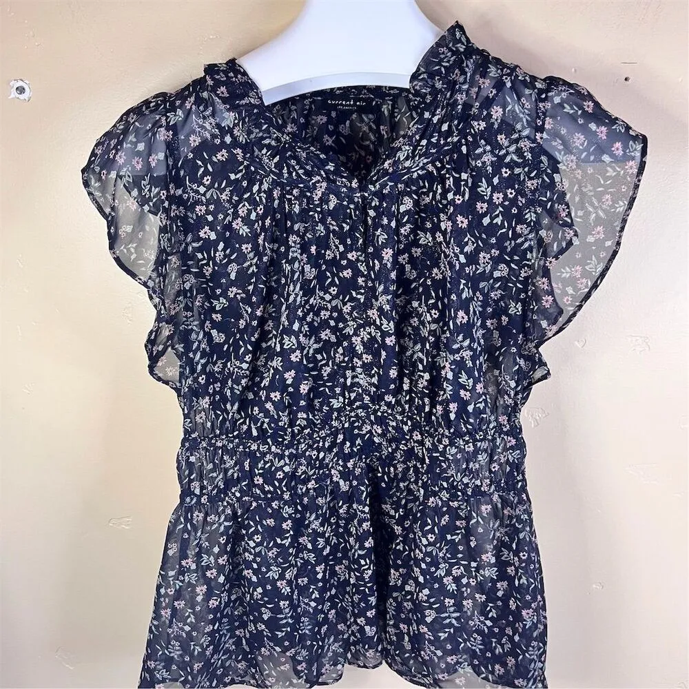 This Current Air blouse in size L is designed for women and features a regular fit. It comes in a black floral pattern with cap sleeves and ruffle accents. Made from polyester, it is lightweight with a smocked waist. Brand: Current Air Size: L Size type: Regular Color: Black Type: Blouse Department: Women Style: Basic Material: Polyester Sleeve length: Short Sleeve Sleeve type: Cap Sleeve Pattern: Floral Accents: Ruffle Features: Lightweight, Smocked Waist Fit: Regular Garment care: Hand Wash Only Measurements: Chest 15” Length 26” Great Condition. No Stains, Tears, Rips, Holes or Pilling. From a smoke free home and perfume free home. We carefully inspect each item for quality.