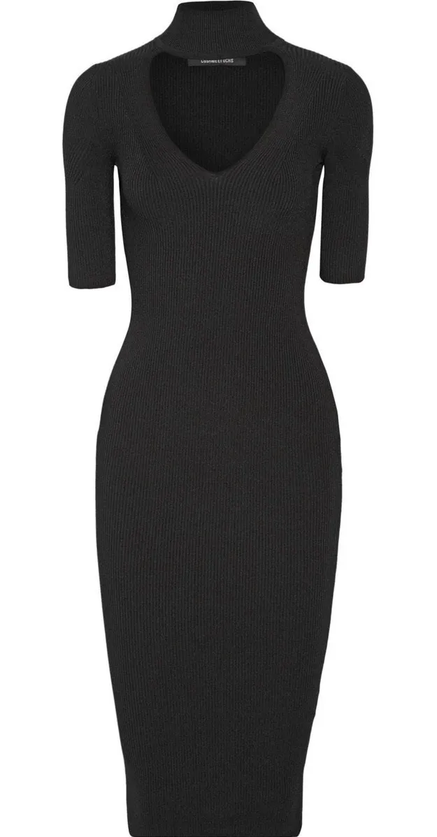Cushnie et Ochs Black Ribbed Cutout Turtleneck Midi Dress Size S Length: 48", Pit to Pit: 14", Sleeve: 13" Condition: Excellent pre-owned. No flaws noted. Material: 83% rayon, 17% polyester Made in USA Sleek black ribbed knit midi dress featuring a deep V-neckline, short sleeves, and a sculptural cutout mock neck. Stretchy, body-contouring fabric with a minimalist silhouette characteristic of Cushnie et Ochs. Modern, elegant, and perfect for evening wear, events, or elevated minimalist outfits. Measurements are approximate. Keywords: Cushnie, Cushnie et Ochs, black knit dress, cutout turtleneck dress, ribbed midi dress, minimalist dress, designer dress, bodycon knit, evening dress, little black dress.