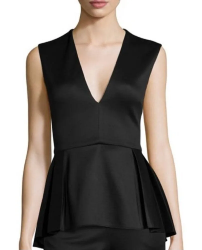 Cushnie Et Ochs V Neck Pleated Silk Wool Black Sleeveless High Low Peplum Top. Deep V neckline. Sleeveless; wide shoulder coverage. Peplum waist with box pleats. Fitted silhouette. Hidden back zip. Wool/nylon/spandex; silk/spandex lining; dry clean. Made in USA of Italian materials. 68% Wool, 28% Nylon, 4% Elastane. Fully lined with 93% Silk, 7% Elastane. Like new. Size 4. Ptp: 16 inches Waist: 13 inches Length: 25 - 27 1/2 inches *Measurements upon request if not already included. Pet friendly, smoke free home.*