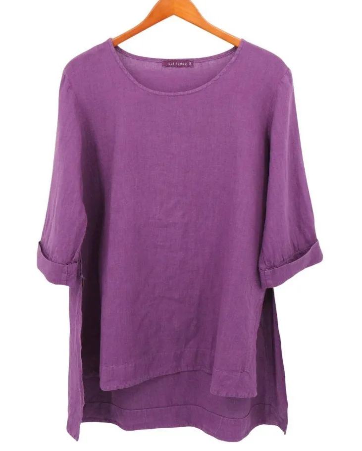 Cut Loose Purple Linen Hi/Low Slit Hem Tunic Top Size: Medium 100% Linen 3/4 length sleeves with turned up ends Hi/low hemline with side slits Care: Machine wash In excellent condition! Approx. Measurements: Length: 31.75" down from back of neck Across underarms: 20.25" Shoulder seam to end of sleeve: 16" A7
