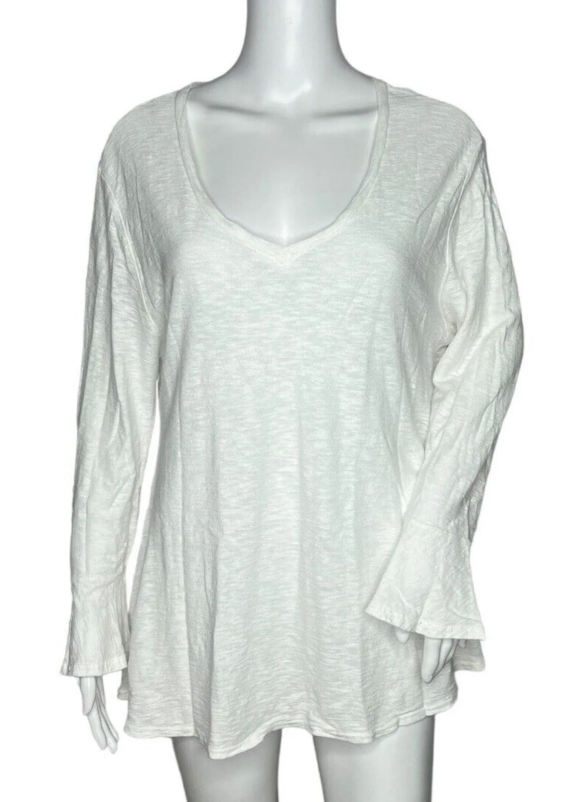 Cut Loose Shirt Womens Medium White Bell Sleeve Neutral Bohemian Chic Lagenlook Women's Size Medium Long Sleeve V-Neck Sharkbite Hem Lightweight Breathable Flowy Pullover Style Material Tag Missing, Feels Like Cotton Measurements are Approximate: Length 28" Armpit to Armpit 21" Gently Used Condition. No Rips Tears or Stains. (1645)