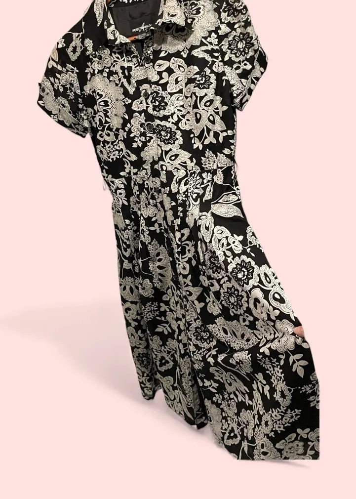 . GUC. Missing belt. Brand is Positive Attitude. Size 4 petite. Small spots on the front (shown in photo - just needs washing). Midi length. Boho whimsigoth minimalist maximalist. Measurements taken laying flat are approximately: Pit to pit: 19” Length: 45” Waist: 15.5” Hip: 23” Sleeve: 6.25”