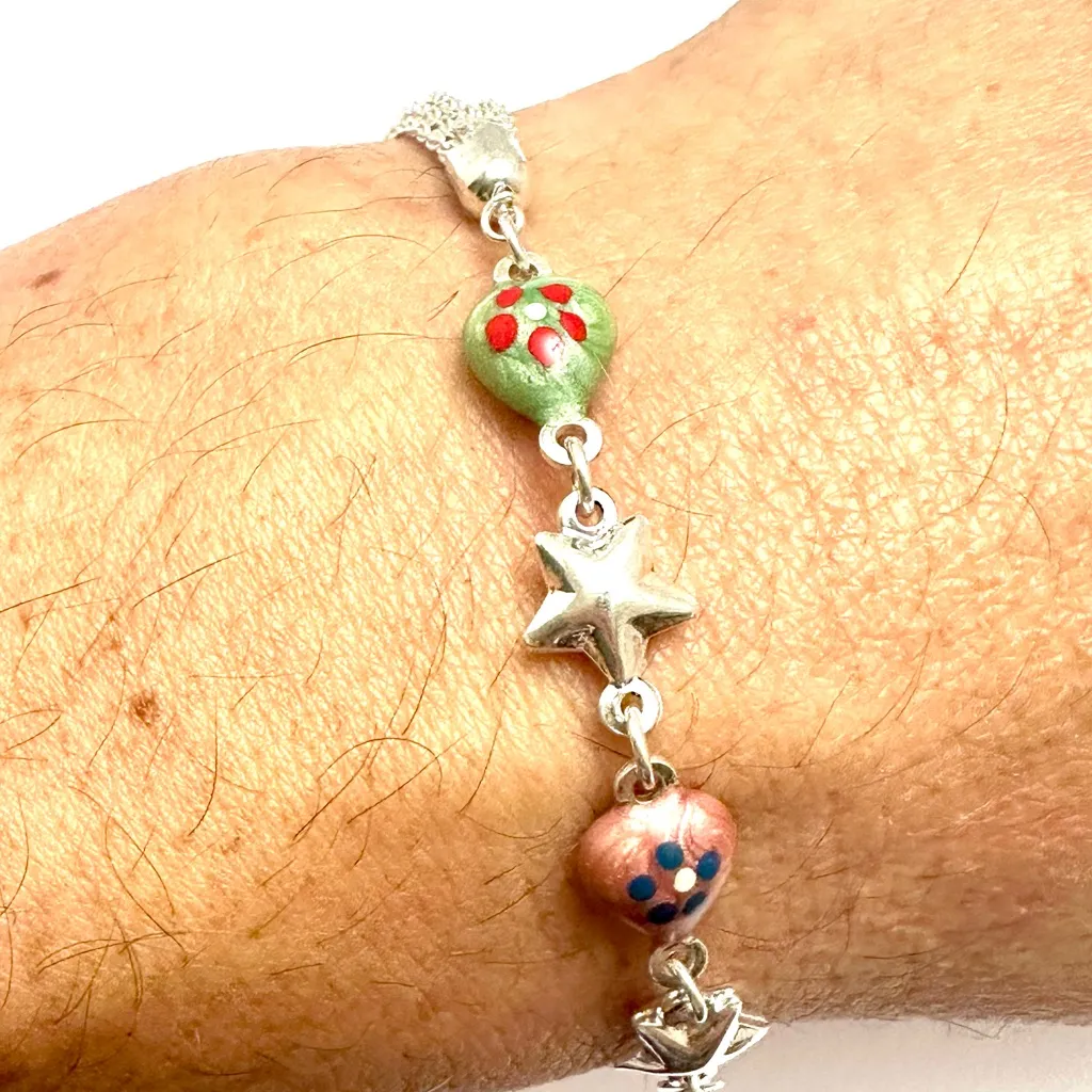 This vintage Sterling silver bracelet features heart-shaped enamel charms set in a stunning silver c... Show more