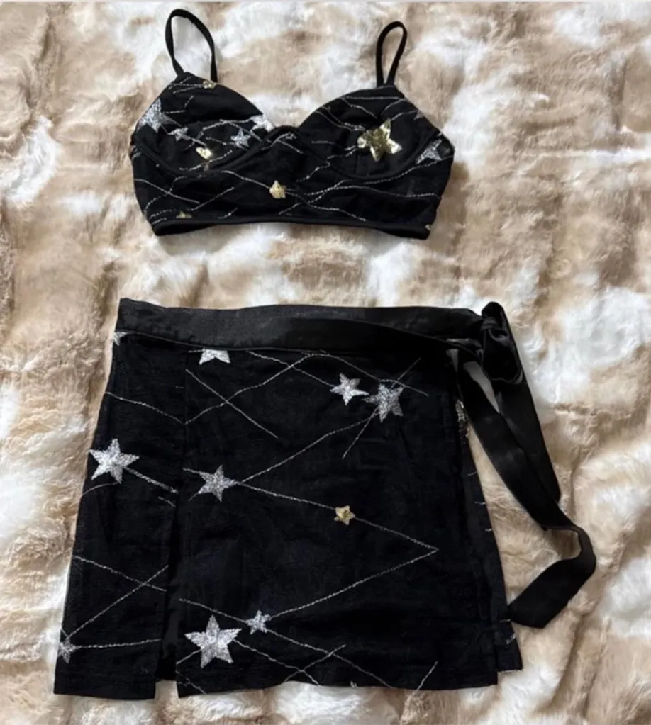 This is a women's unbranded two-piece skirt set in size S, featuring a black fabric with silver and gold star embellishments and white embroidered lines. The set includes a cropped bralette-style top with spaghetti straps and a matching mini skirt with a wrap-around design and a high slit on the left side, secured with a black tie. The fabric appears to be a sheer mesh overlay with an opaque lining. The item is new without tags.
