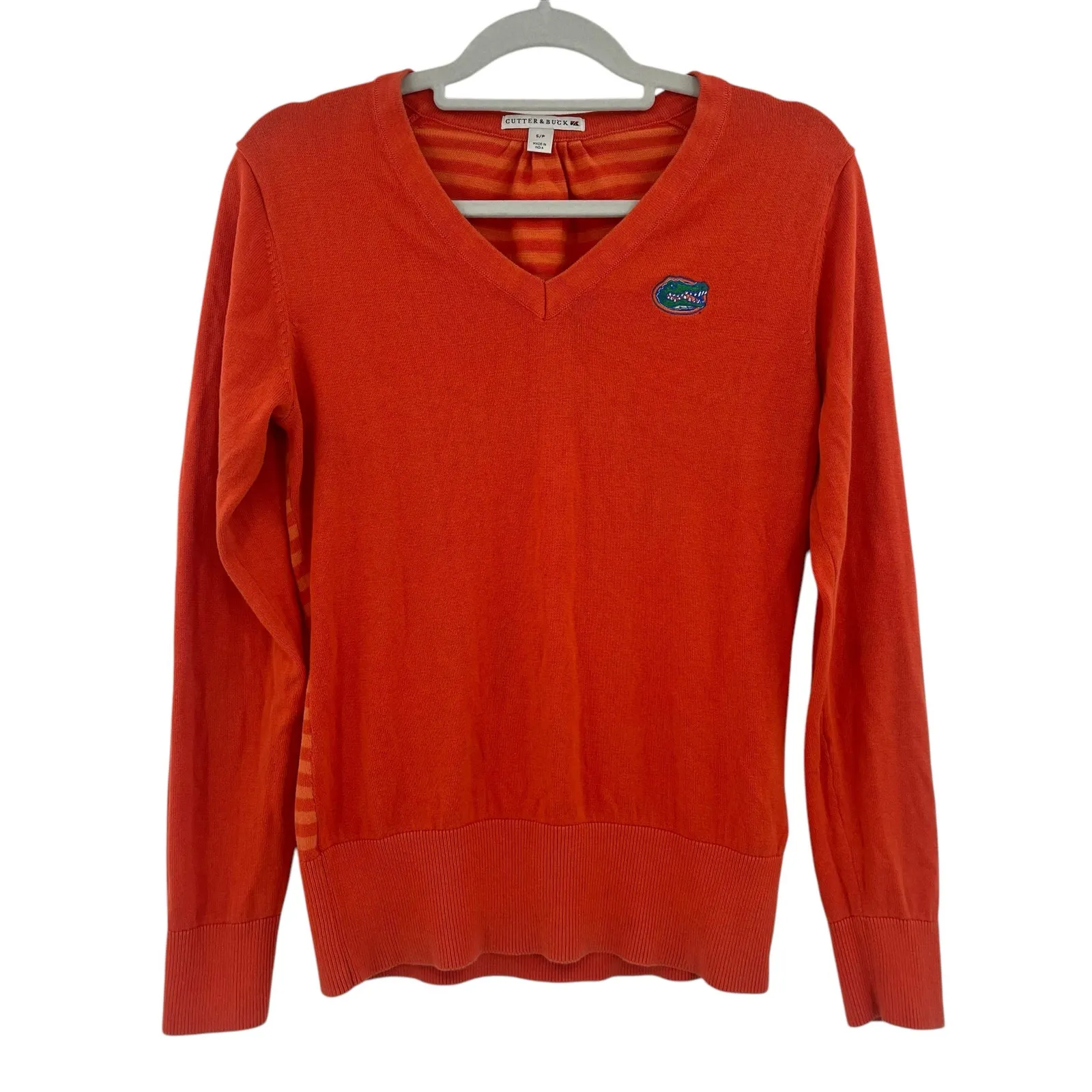 Orang Cutter & Buck University of Florida UF Gators V-Neck Long Sleeve Sweater Preppy Long sleeve with ribbing at end of cuffs and waist, Embroidered Gator on chest, striping on back Pre-owned condition, please see photos, slight small dots on back, mild pilling on side Size Small 100% Cotton Approximate measurements in inches: Pit to pit: 18.5 Shoulder to hem: 23.5 Sleeve length (from underarm): 20.5 UF, Univeristy of Florida, Florida Gators, Gators, Collegiate, Stripe, Embroidered, Logo, sporty prep, gameday outfit, tailgate wear, striped back, colorblock, NCAA gear, athletic chic, campus style, Cutter & Buck, fall football, Y2K Inspired,, Gameday, Preppy, golfcore, country club, quiet luxury, classic, collegiate, breathable, golf, athleisure