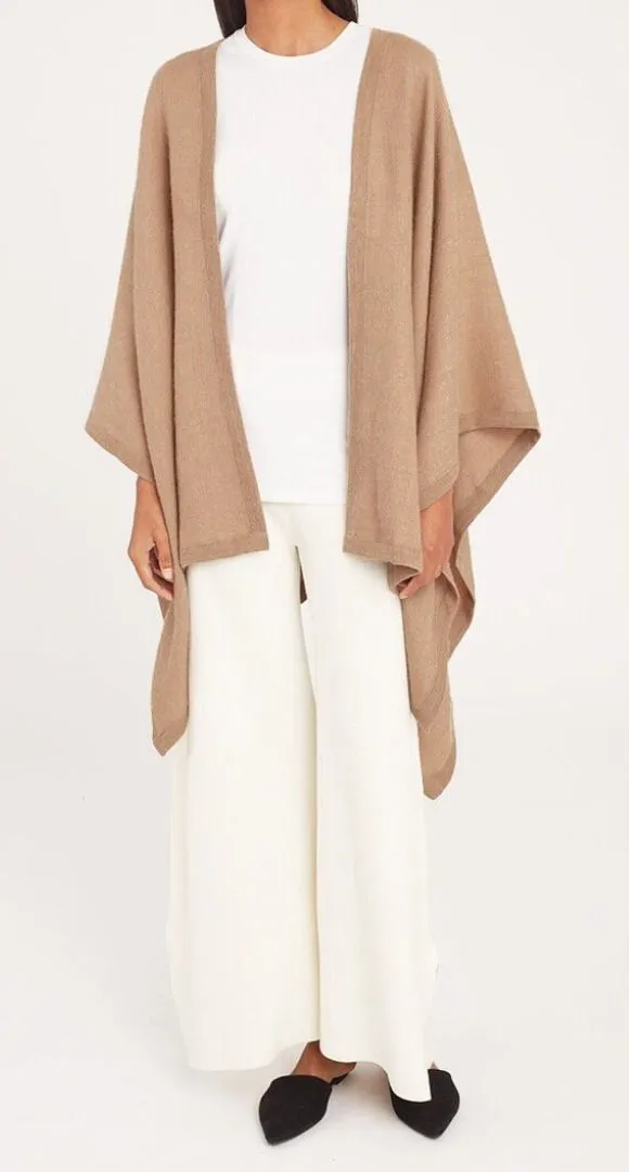 A luxurious Cuyana baby alpaca shawl wrap in a versatile camel beige hue. This piece offers an elegant drape and a relaxed, open-front silhouette, perfect for layering. The fine knit construction provides warmth and a soft feel against the skin, while the generous cut allows for various styling options. 100% baby alpaca. Size small. Very good pre-owned condition. Some wear along the edges as shown. A1.