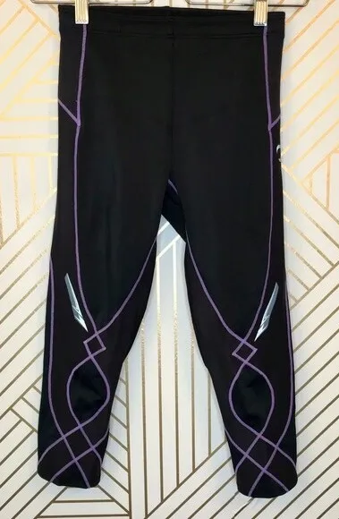 CW-X Stabilyx 3/4 Length Tight in Black and Purple. Women's running tights.. UPF 40+ for UVA/UVB protection. Key pocket: For storage. Reflective logos: For added visibility. Double-reinforced waistband with flat draw cord. Waist is approx 11.25" Front rise is approx 8.5" Inseam is approx 18"