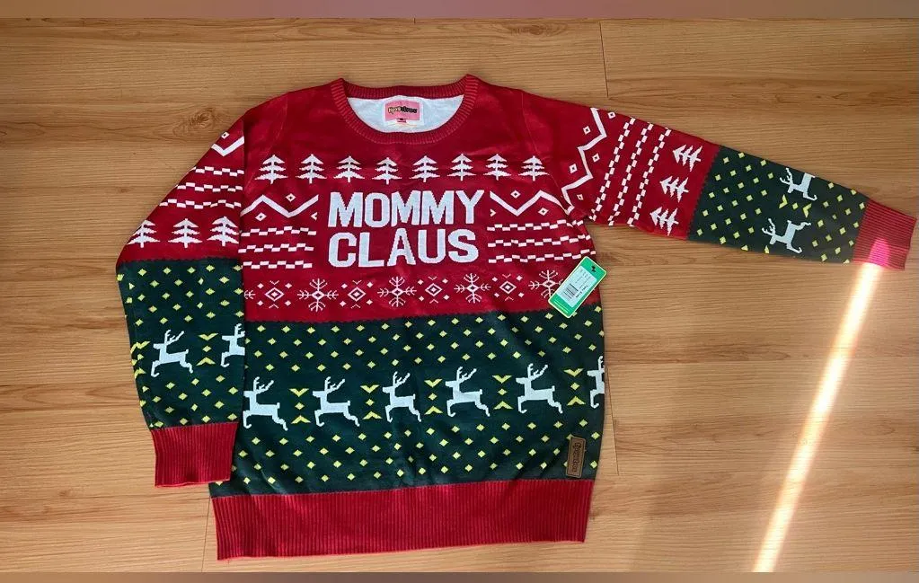 Get ready for the holiday season with this festive Tipsy Elves Sweater! This tight-knit pullover features a classic green and red color scheme with a playful Santa Claus character design. Made from synthetic materials, this sweater is perfect for both men and women in a size large. The regular fit and unisex design make it a great choice for family Christmas photos or holiday parties. Whether you're looking to add some holiday cheer to your wardrobe or want to make a statement as a "Mommy Claus", this sweater is sure to become a new holiday tradition.