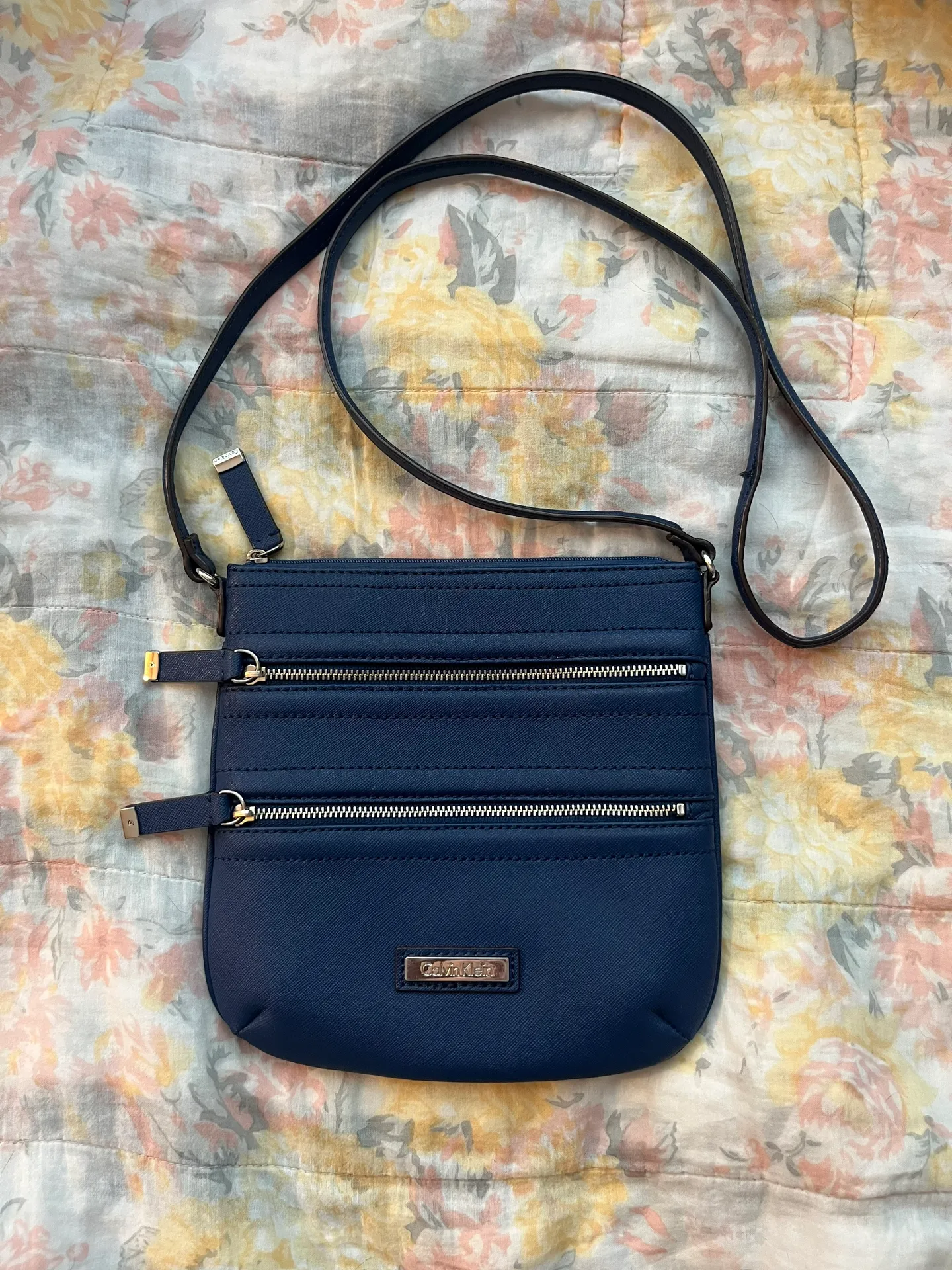 Calvin Klein blue saffiano leather crossbody bag. It was only used a few times, the crossbody strap... Show more