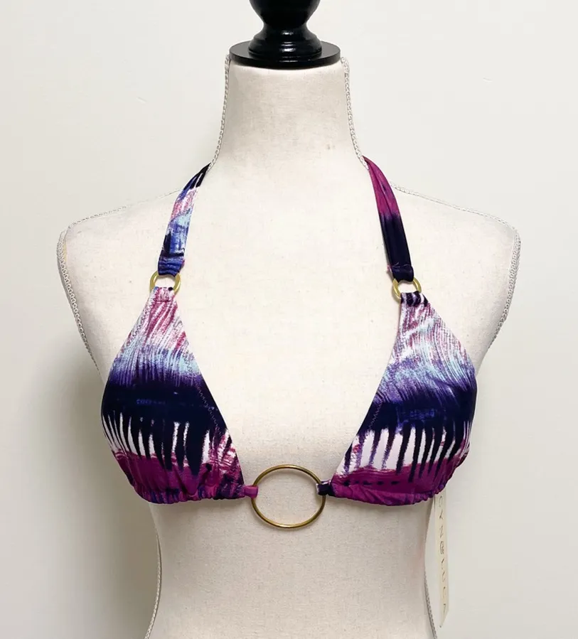 Swimwear Brand: Cyn and Luca Size: Small (**please see photos for approximate measurements**) Style: “Purple Tie Dye” print sliding triangle bikini top. Halter neckline and back tie closure. Gold tone ring accents in between the cups and flat gold tone ring accents on the straps. Soft cups with removable cup pads. No underwire. Hand wash garment care. Condition: New old stock (NOS) with tags but please see final photo as there is wear and discoloration on the gold tone ring. Comes from a smoke free home. Please feel free to ask any questions before purchase. I typically ship within 24 hours but please be advised that I don’t ship on Saturdays or Sundays. Thank you for understanding!