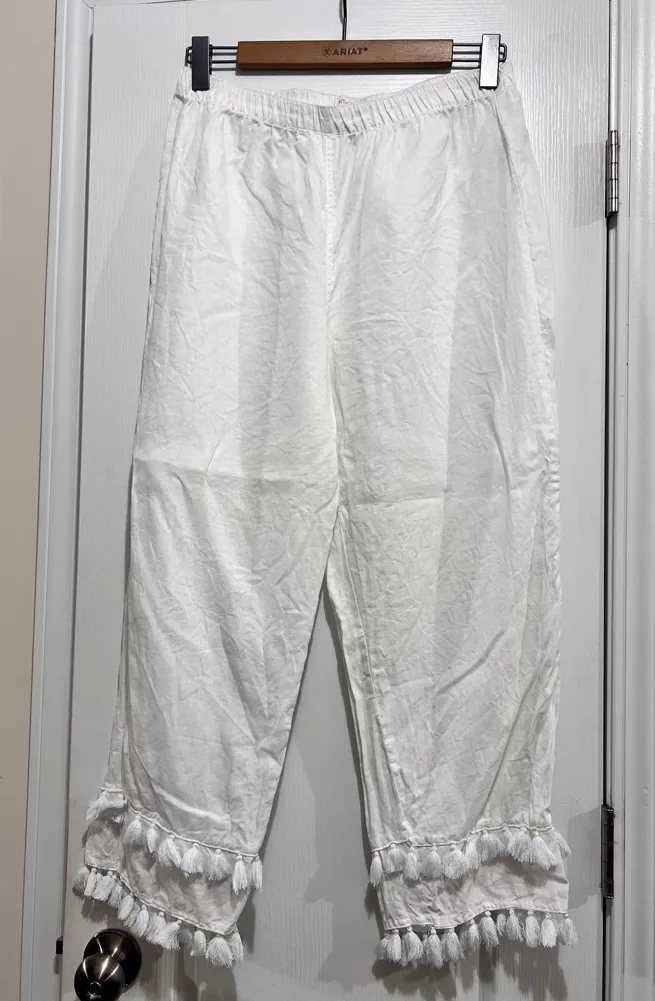 100% linen capris by Cynthia Rowley. Tassel detail on bottom. Pull on style, elastic waist. Ladies s... Show more
