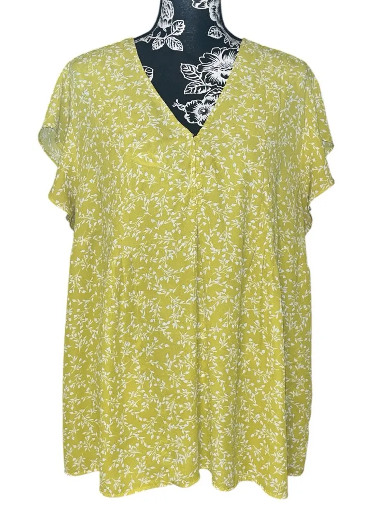 Leave print detail Flutter cap sleeve 5 button front closure Pleated seam detail Polyester No flaws... Show more