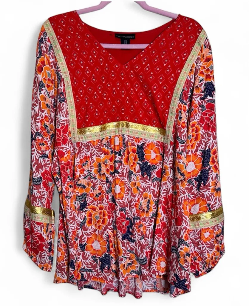 Cynthia Rowley Red Gold Floral Boho Blouse Womens 1X Fall Peasant Flowy Shirt - $28 - From Lisa