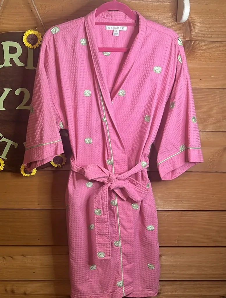 Brand: cypress Description: adorable elephant embroidered waffle knit robe. Pockets and waist tie! Short sleeve, so cozy! No flaws found! Next day shipping!! Measurements taken with the item laying flat and are approximate. Size Medium Due to open front, pit to pit is not measured but it is recommended to stay true to size. Length shoulder hem to bottom 37” Photos are taken under lighting which may cause a variant in color. Please understand every attempt is made to capture true and accurate color. If available, a stock photo may be provided in the photos. All items are suggested to be cleaned according to tag/instructions prior to wear. All items are stored in plastic ziplock bags, free of dust. Thanks for checking out my closet! No cancellations. I am not responsible if full description isn’t read in its entirety. Tags: retro funky boho hippie brunch sustainable fabrics Anthro beachy spring summer beach poolside vacation bubblegum pink like green cotton cozy at home robe bathroom home X8-6