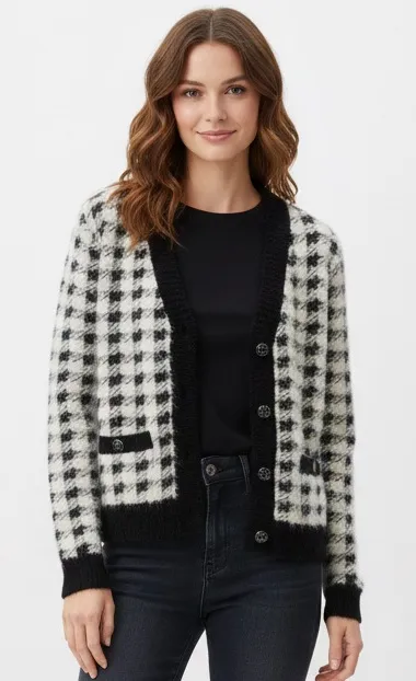 Channeling Coco anyone? This gorgeous cardigan features a fuzzy knit, V-neck line, crested gunmetal... Show more