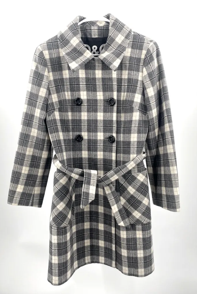 This wool blend belted pea coat is in is in excellent pre-owned condition with no rips,stains or holes. It has 2 big patch pockets on the front. Double breasted and fully lined. There is writing on the back of the tag at the neckline of the coat. Is not visible unless you turn the tag over. Gray, black and white plaid pattern. smoke free/pet friendly home Measurements done with garment laying flat and are approximate. I strive to be as accurate as possible. All garment tags are present and in good condition. Writing on the back of the neck tag. All buttons are present, secure and functional. Buttons located on the right instead of the left. NHP 01102999025 01/13/25