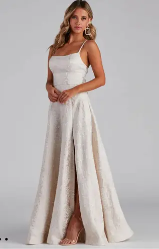 Brocade prom dress with pockets!! Has champagne-colored metallic rosettes throughout with a lace up... Show more