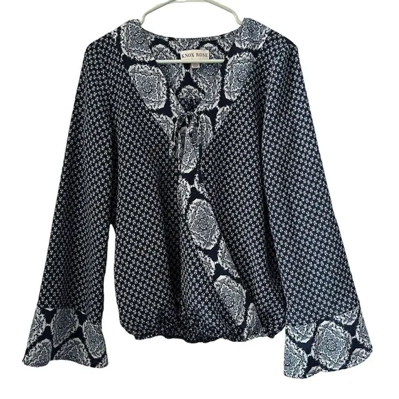 Knox Rose Womens Wrap Blouse Wide Bell Sleeves Size M Blue. Preowned, good condition. Blue and whi... Show more
