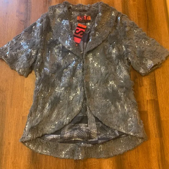 Isle apparel NWT jacket women’s medium grey faux fur sequins two hook cl… Gray - $47 New With Tags - From Tiffany