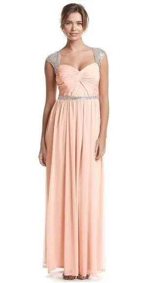 Sequins and rhinestones glitter at the cap-sleeve yoke and waist of this sumptuous Adrianna Papell m... Show more