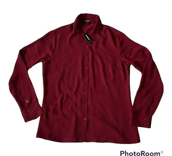EXPRESS Women’s Crescent Classic button front Shirt in Burgundy size Small Long sleeve Roll tab Bran... Show more