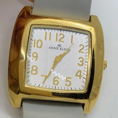 Anne Klein 28mm gold tone Quartz analog ladies watch , gray plastic band , in good condition running