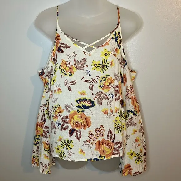 One Clothing Beige Floral Print Cold Shoulder Top Size Small EUC Bell sleeves
