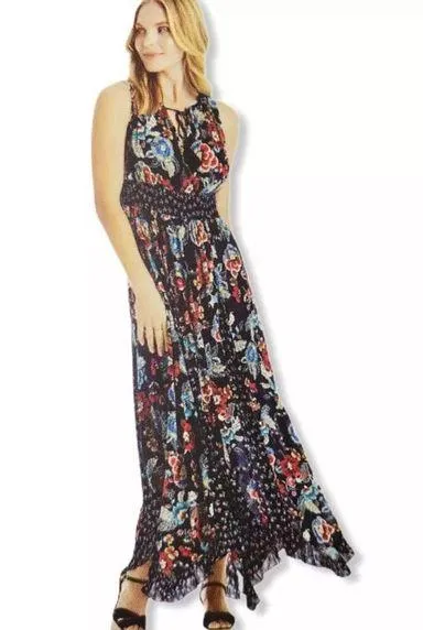 Bila Sleeveless Handkerchief Hem Maxi Dress Sz Small Navy Floral Print Sleeveless Tassle tie Sm... Show more