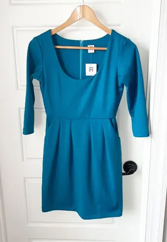 This dress is brand with pockets in the front. The neckline is round and it zips up. Length 33”