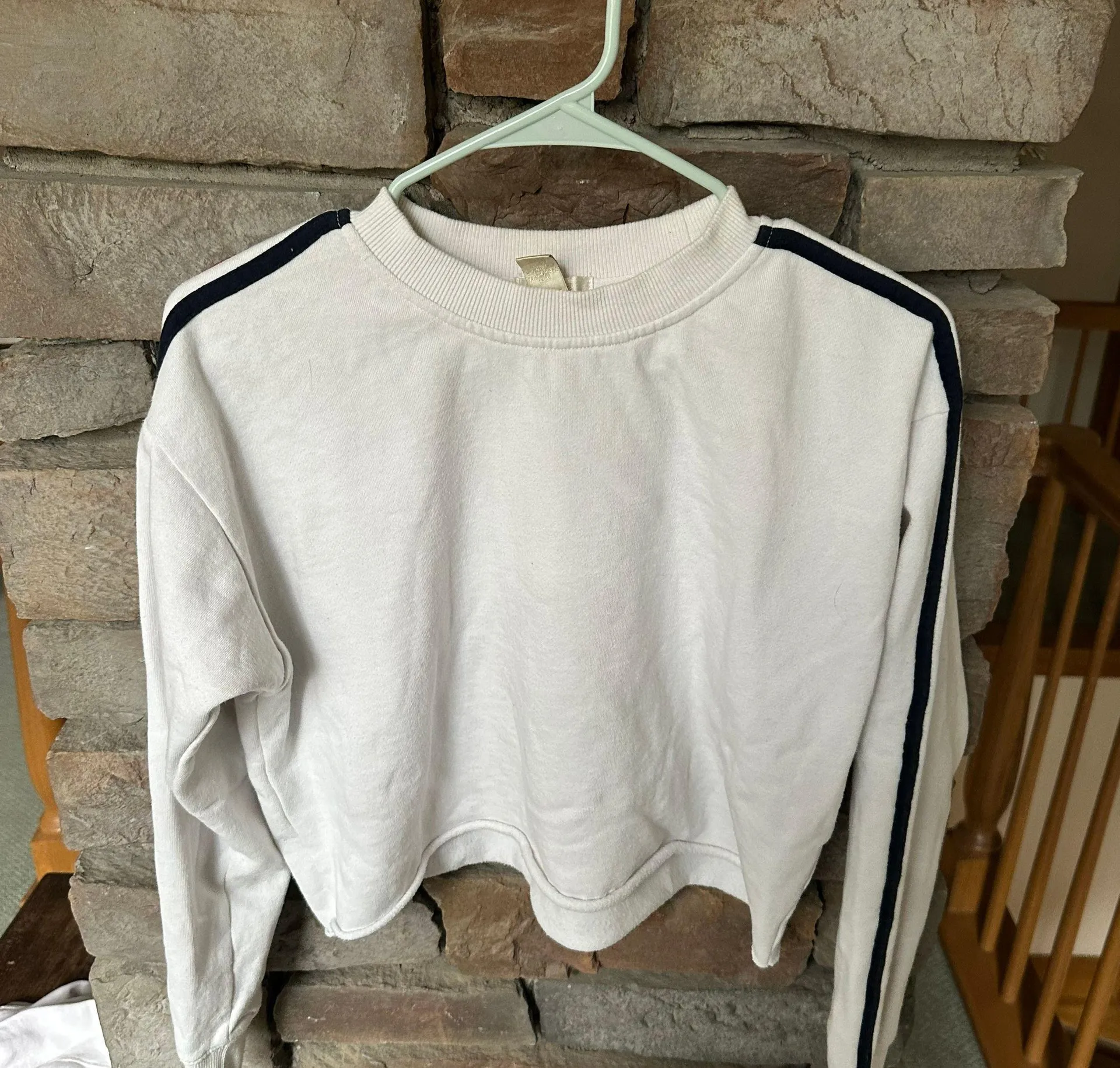 White cropped crew neck that has a blue and red stripe going down the sleeves on each side, it’s in... Show more