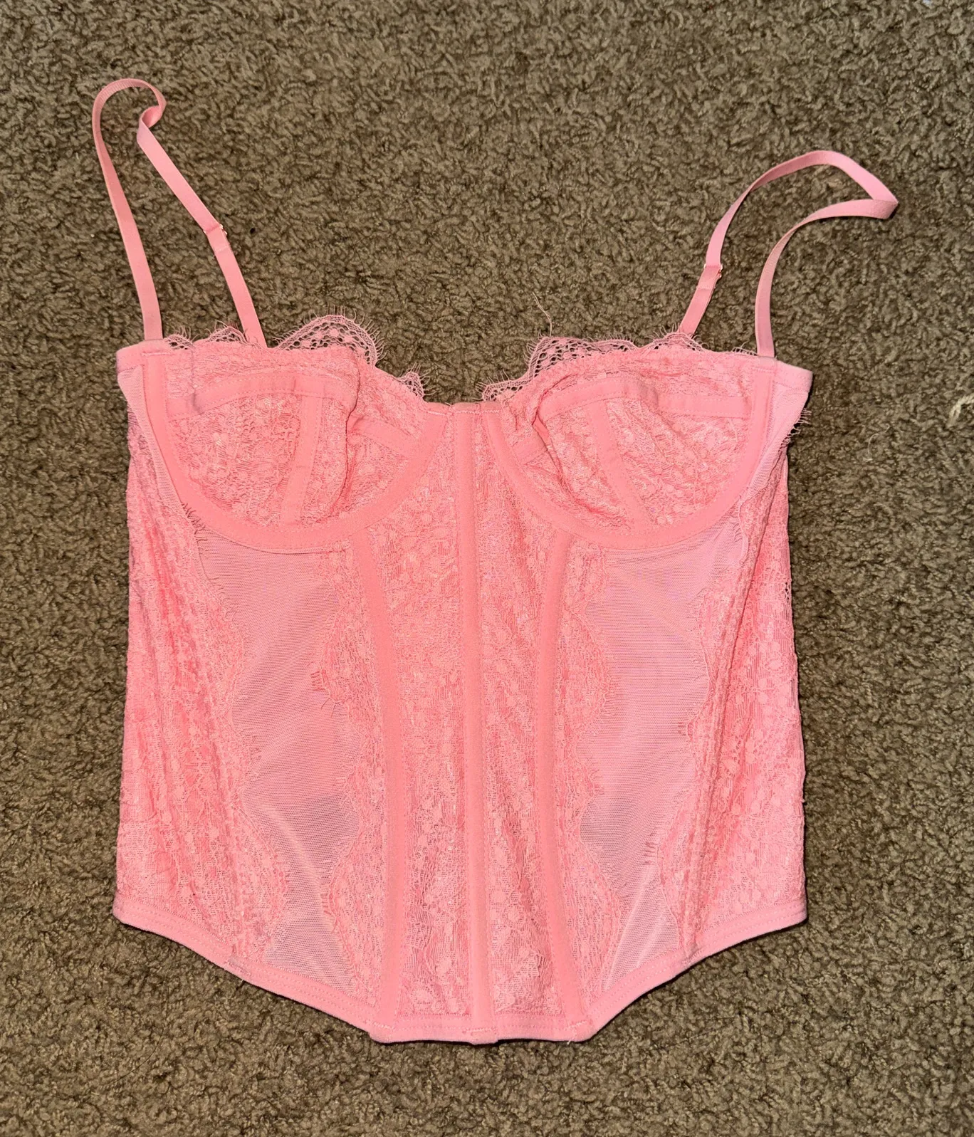 Baby pink Urban Outfitters lace corset top -adjustable straps -3 clip size settings in back Worn a... Show more