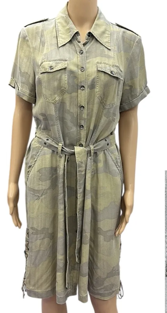 Questions? Leave a comment below! Vintage Da-Nang 100% Machine Washable Silk Short Sleeve Full Button Up (with metal buttons) Camo print Utility 4 Pockets Tie Belt Lace up sides at hem to about 8 inches up Collared Dress Womens Medium (measurements below) good vintage preowned condition as seen in pictures. Please be sure to refer to pictures for style and check following measurements against something you currently own as most brands, styles or years of clothing size differently or preowned clothes could shrink or stretch (vintage items were made smaller) I may have accidentally thought something was a womens size verses juniors. if theres any additional info you need please ask before purchasing. Measurements are flat across front only Chest (pit to pit) 20.5” Waist 17.5” Across hem 32” Underarm to hem 28.25” Sleeves (Underarm to cuff) 2.5” Shoulder to hem 39” Shoulder to shoulder seam 16”