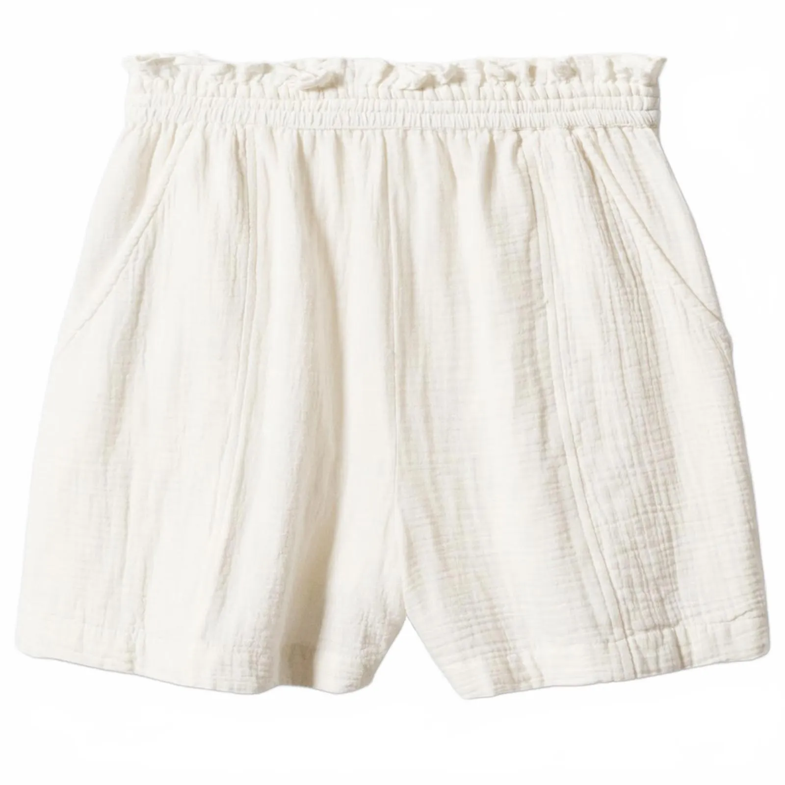 100% cotton. Textured fabric. Paperbag. Short. Mid-rise. Two side pockets. Elastic waistband. No clo... Show more